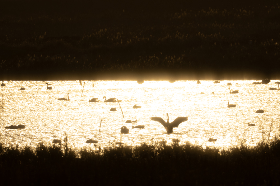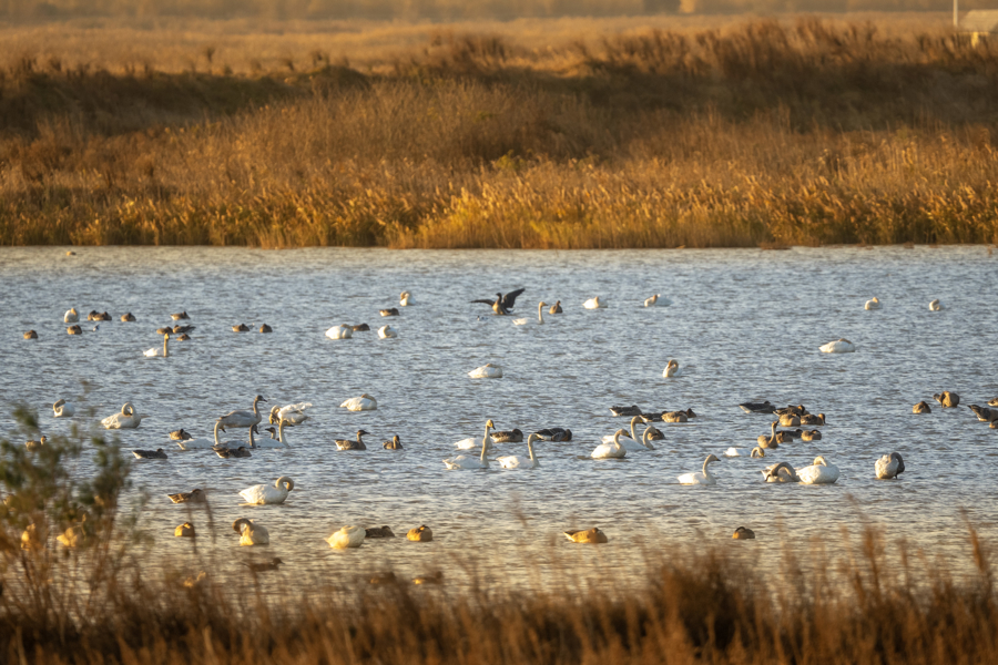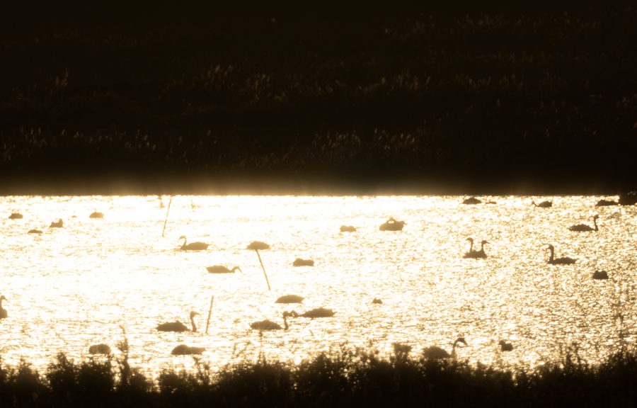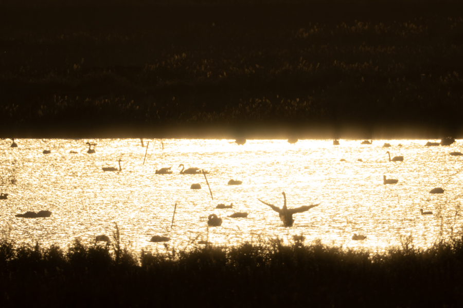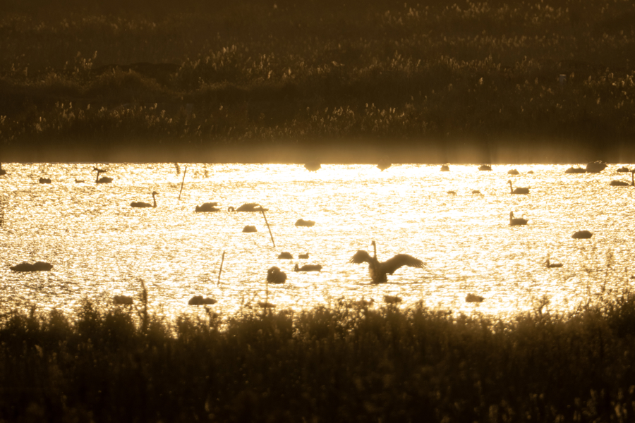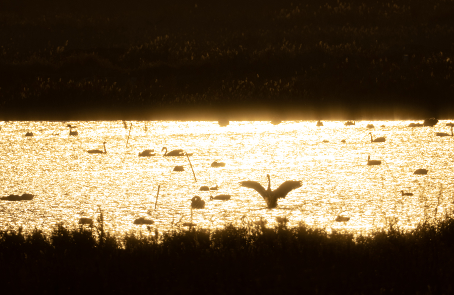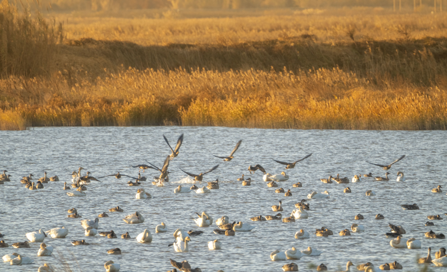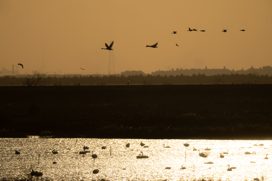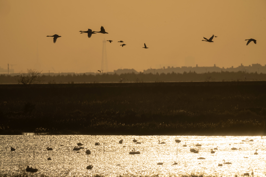 2025年12月10日,傍晚时刻,上海崇明东滩鸟类国度级当然保护区内水面上栖息的野生鸟群们与“金光”共舞。