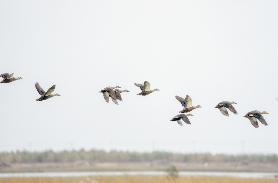 上海崇明东滩鸟类国度级当然保护区内翱翔的斑嘴鸭。