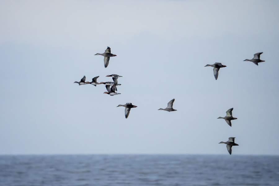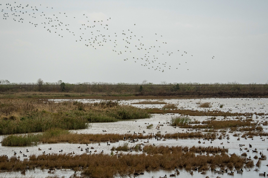 上海崇明东滩鸟类国度级当然保护区内成群翱翔的斑嘴鸭和鸳鸯。