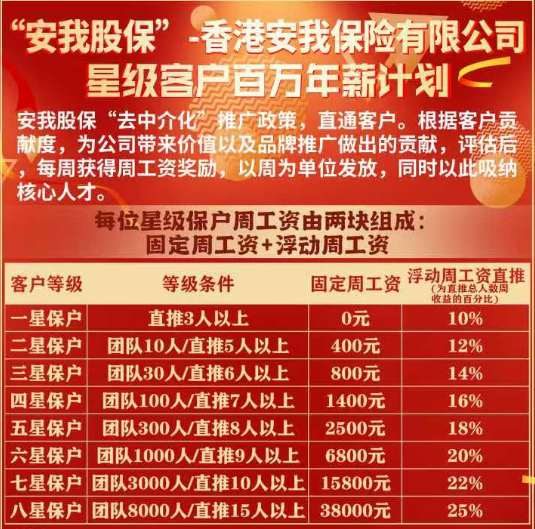 关于星级客户百万年薪霸术,“安我股保”劳动号发布的信息夸耀,“安我股保”会凭证客户孝敬度,为公司带来的价值以及品牌扩充作念出的孝敬,赐与客户一定的周工资奖励。