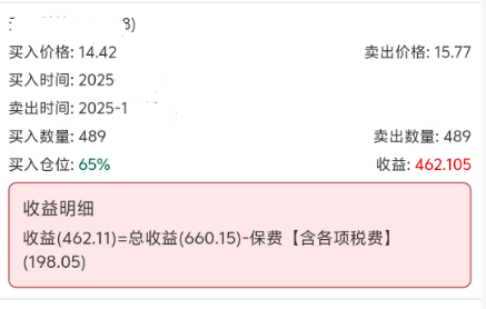 举例,今日投保的是某科技股,买入价钱为14.42元,卖出价钱为15.77元,用户来去数目489股,收益就是462.11元,即总收益660.15元减去保费198.05元。