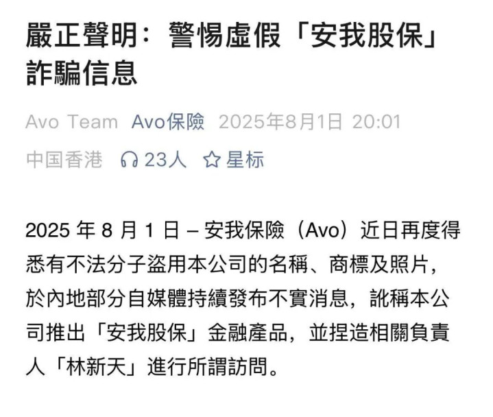 《逐日经济新闻》记者提防到,香港安我保障的官方劳动号上置顶了两篇跟“安我股保”推断的声明。声明提到:安我保障近日再度得悉有作歹分子盗用本公司的称呼、商标及相片,于内地部分自媒体赓续发布虚假音问,讹称本公司推出“安我股保”金融家具,并抓造推断认真东谈主“林新天”进行所谓拜访。
